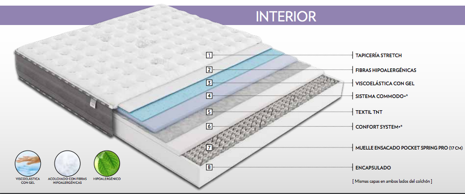 ACOGIDA VISCOELÁSTICA CON GEL DE ALTA DENSIDAD. Proporciona una perfecta adaptación al cuerpo cediendo únicamente donde se ejerce presión. Relleno hipoalergénico y con estructura de célula abierta que garantiza la autoventilación manteniendo una temperatura constante. Gracias a sus partículas de gel conseguimos una excelente sensación de frescor y confort térmico. ACOLCHADO CON FIBRAS HIPOALERGÉNICAS. Fibra compacta de alta calidad, especialmente diseñada para reducir el riesgo de producir reacciones alérgicas y contribuir a mantener una temperatura constante. Ofrece una acogida progresiva y un excelente grado de confort. Mantiene una circulación continua del aire en su interior favoreciendo un alto nivel de recuperación del colchón. SISTEMA COMMODO+®. Material de alta densidad que permite una adaptación progresiva al cuerpo evitando cualquier punto de presión.
