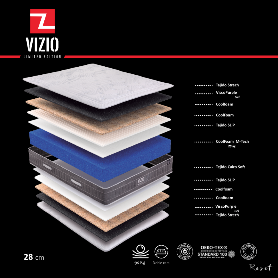 El colchón ENVIDIA pertenece a la colección Vizio de la marca Reset. Es el tercer y más alto de la gama de espumaciones. Cuenta con un núcleo de HR CoolFoam M-Tech de 28kg de densidad y una capa de ViscoPurple gel en el acolchado mas 7cm de ViscoPurple en el núcleo. Con una altura de 30cm, tejido Strech tapa-tapa y a doble cara.