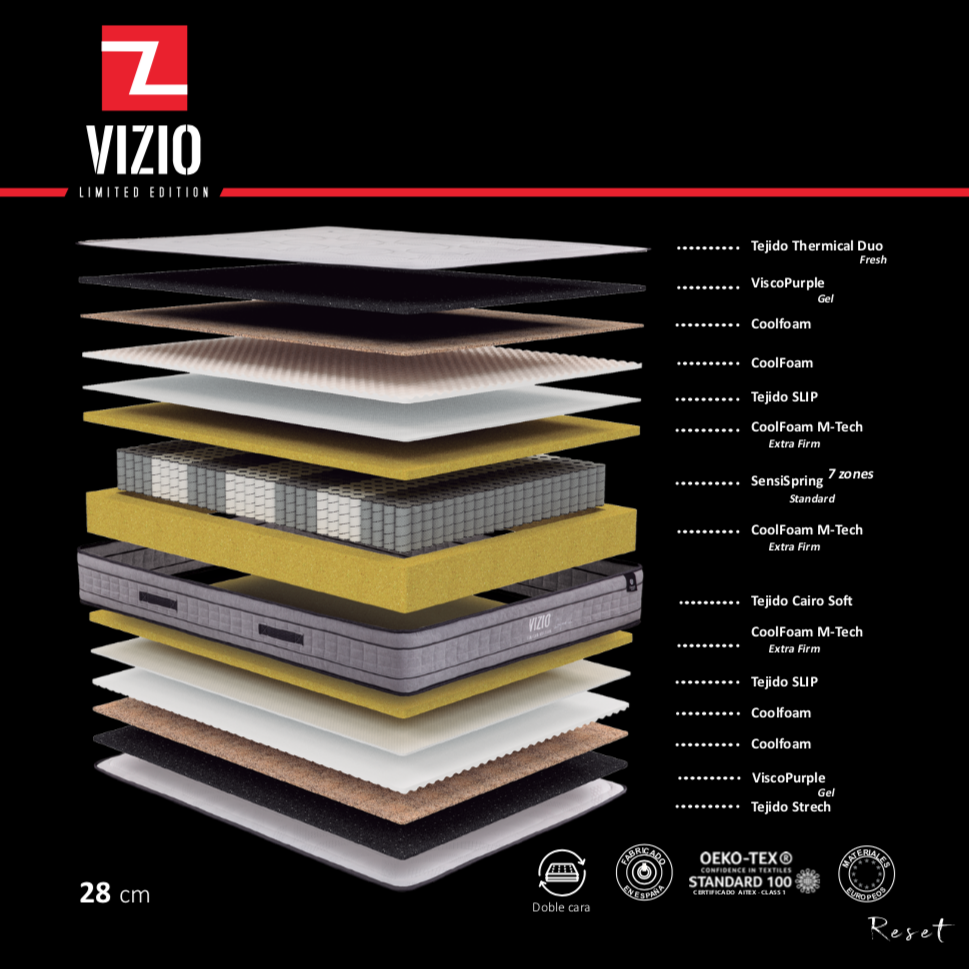 El colchón LUJURIA pertenece a la colección Vizio de la marca Reset. Es el modelo superior de su gama de muelles ensacados. Cuenta con un núcleo de muelles ensacados SENSISPRING DE 7 ZONAS y una capa de ViscoPurple gel en el acolchado en cada cara. Con una altura de 28cm, tejido Strech tapa-tapa y a doble cara. Ademas incorpora en una de sus cara la novedosa tecnología THERMICAL DUO FRESH que consiste en un tejido que no absorbe el calor y se mantiene siempre fresco, ideal para los meses calurosos de verano.