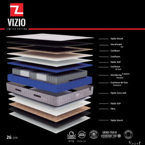 El colchón SOBERBIA pertenece a la colección Vizio de la marca Reset. Es el primero de su gama de muelles ensacados. Cuenta con un núcleo de muelles ensacados SENSISPRING DE 5 ZONAS y una capa de ViscoPurple gel en el acolchado. Con una altura de 26cm, tejido Strech tapa-tapa y a doble cara.