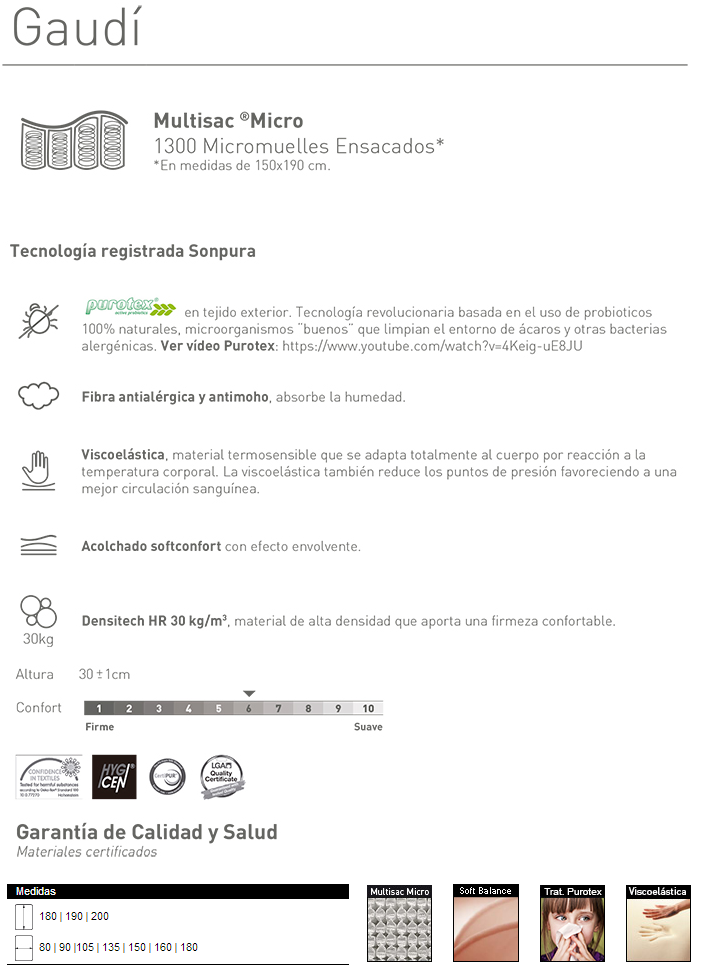 Si buscas un descanso adaptable, cómodo y transpirable, el colchón Gaudí de Sonpura es el colchón que buscas.  Sus muelles ensacados nos dan la frescura del muelle y la adaptabilidad de la viscolástica.
