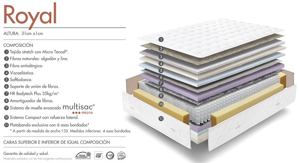 El colchón Royal de Sonpura está compuesto de un núcleo Multisac Micro®, Bodytec Plus de 35 Kg/m3. y un acolchado de 2 cm. de viscoelástica de alta densidad que aporta una gran adaptabilidad, confort y firmeza medio-dura (4). Cuenta con un núcleo de 1800 muelles ensacados en ancho 150.