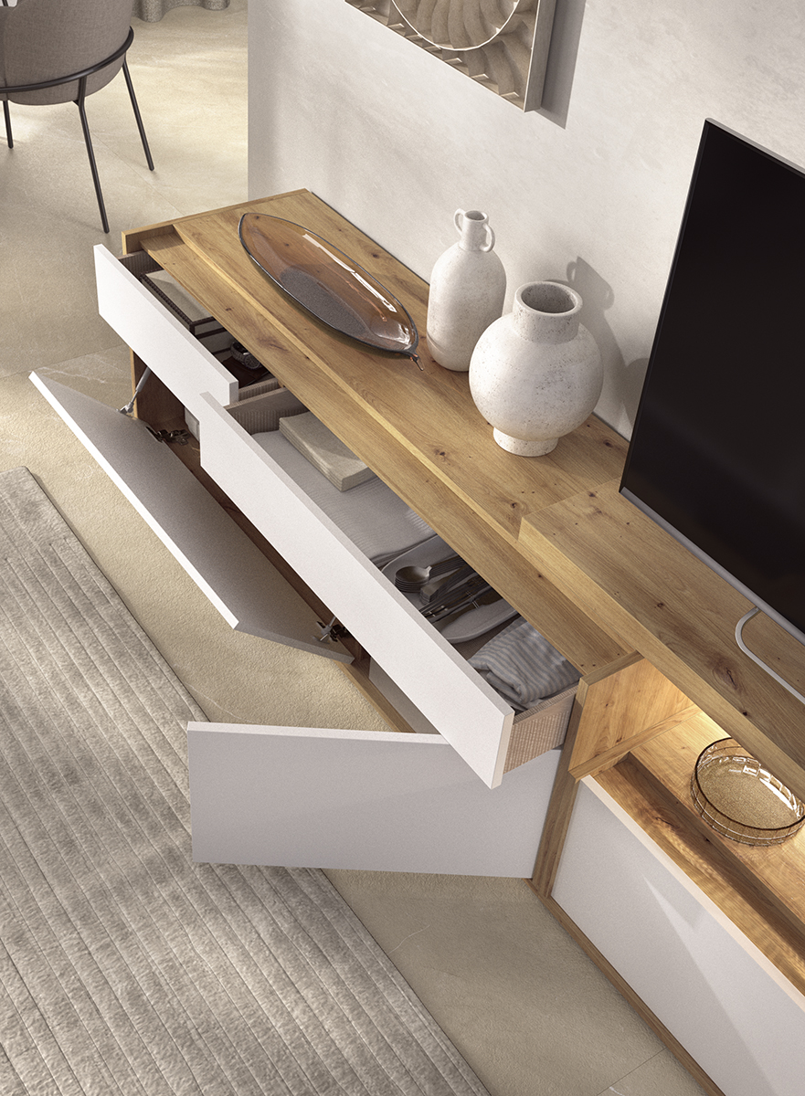 DUO es una colección de muebles de salón que convertirá su casa en un espacio confortable, práctico y actual. Sus diferentes propuestas de combinaciones, medidas y acabados y los diferentes usos que sus diseños ofrecen son la solución perfecta para hacer más habitable su hogar.