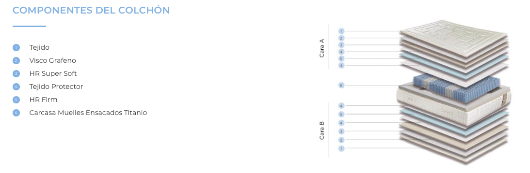 Gran confort y adaptabilidad con acogida progresiva. El Visco grafeno reacciona al calor del cuerpo, siendo altamente adaptable además de ayudar a disipar el calor, lo que le confiere su propiedad de climatización.