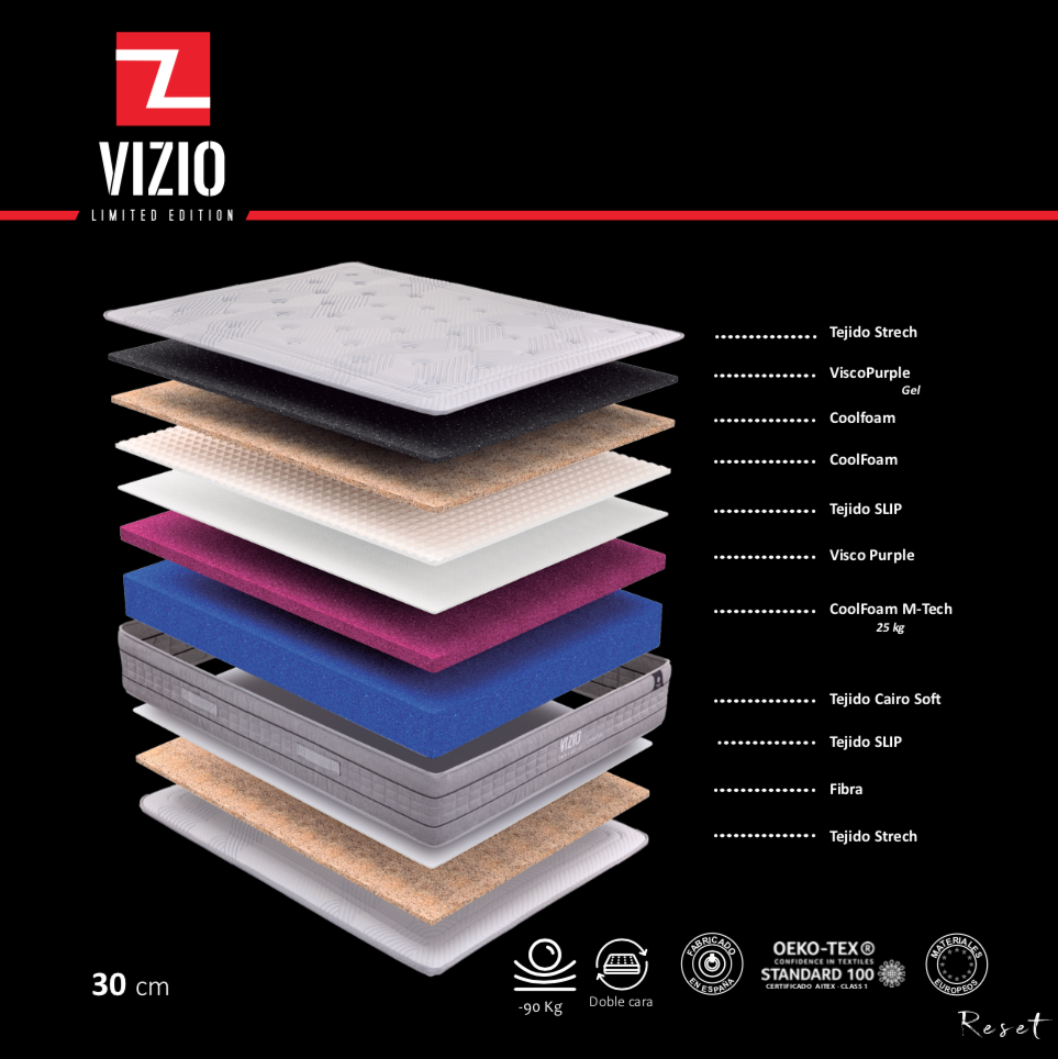 El colchón ENVIDIA pertenece a la colección Vizio de la marca Reset. Es el tercer y más alto de la gama de espumaciones. Cuenta con un núcleo de HR CoolFoam M-Tech de 28kg de densidad y una capa de ViscoPurple gel en el acolchado mas 7cm de ViscoPurple en el núcleo. Con una altura de 30cm, tejido Strech tapa-tapa y a doble cara.